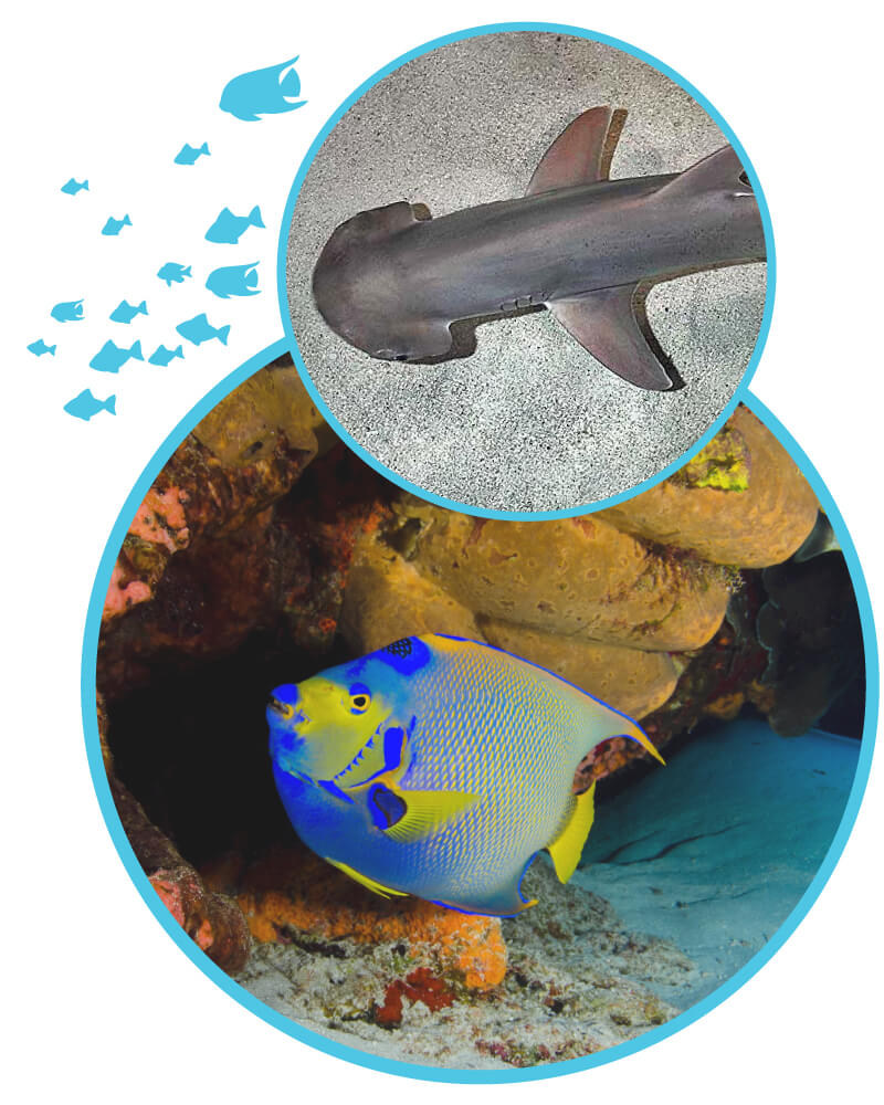 The Swamp gallery features the iconic cypress swamp with towering cypress trees. Here, you can find Florida native species such as alligators and turtles taking a swim among the freshwater fish. Keep your eyes peeled and look up to see if you can spot squirrels running above your head through multi-dimensional tunnels. This area also features a presentation space for our beloved animal ambassadors, who will make regular appearances to teach our guests how to be active stewards of the environment.
