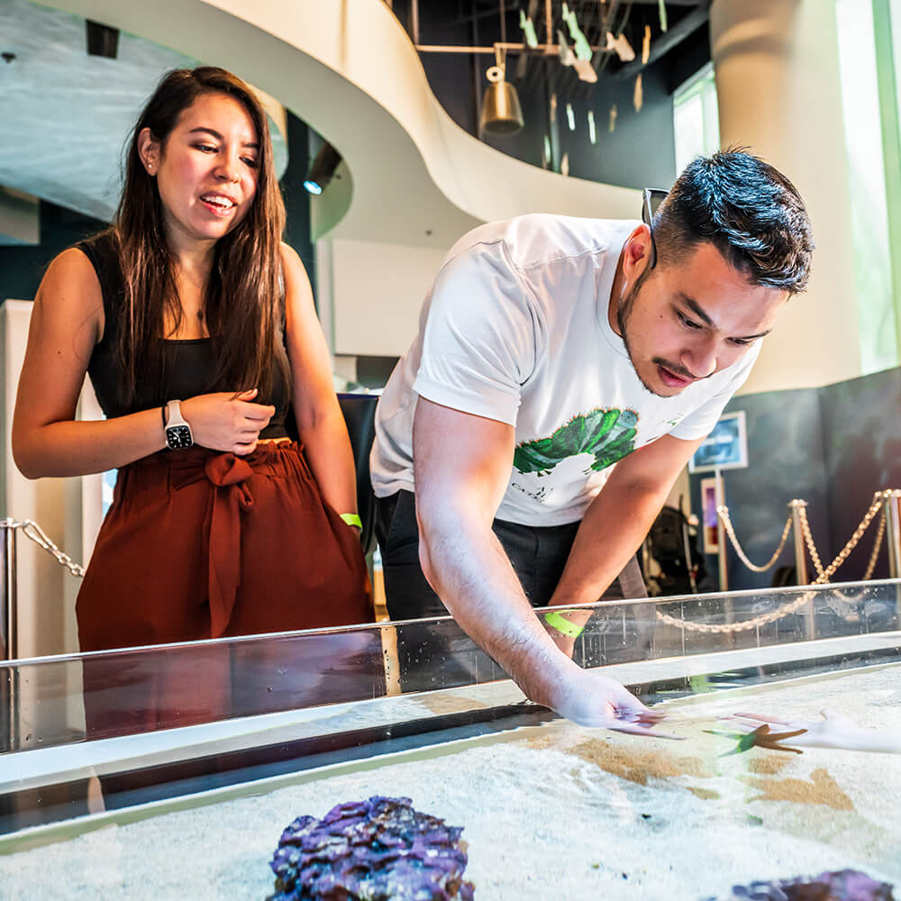 Swim on down to the Ocean gallery and come face to face with a 360-degree viewing area full of colorful reef fish and sleek, shimmering sharks. Here you can find amazing interactive exhibits that highlight the crucial role that our reefs play in the environment. From live coral displays to hands-on experiences, you can “get your feet wet” as a marine biologist and learn how sea stars eat and how crabs grow!